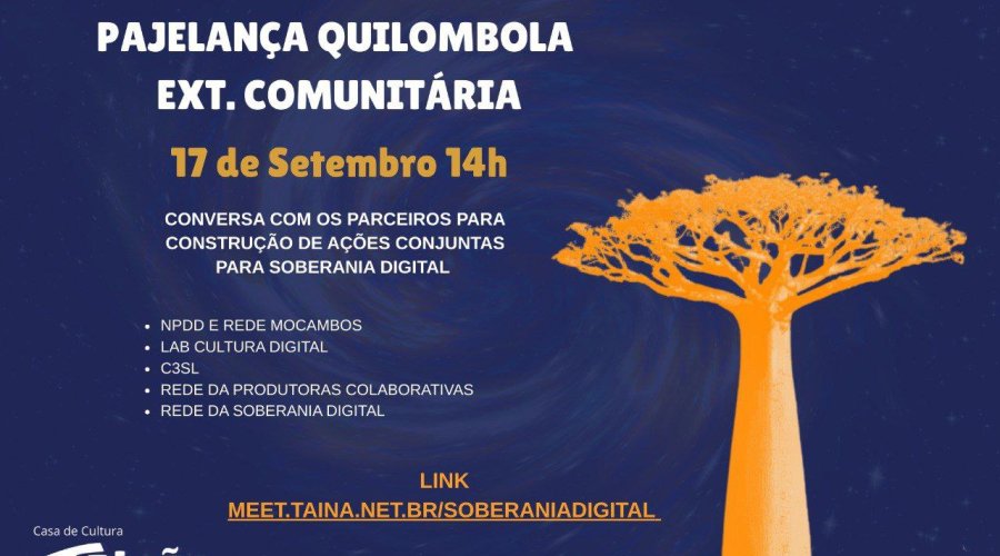 Vamos dialogar sobre como a política de extensão comunitária e as práticas comunitárias da Casa Tainã e Rede Mocambos apontam caminhos concretos para a soberania digital.