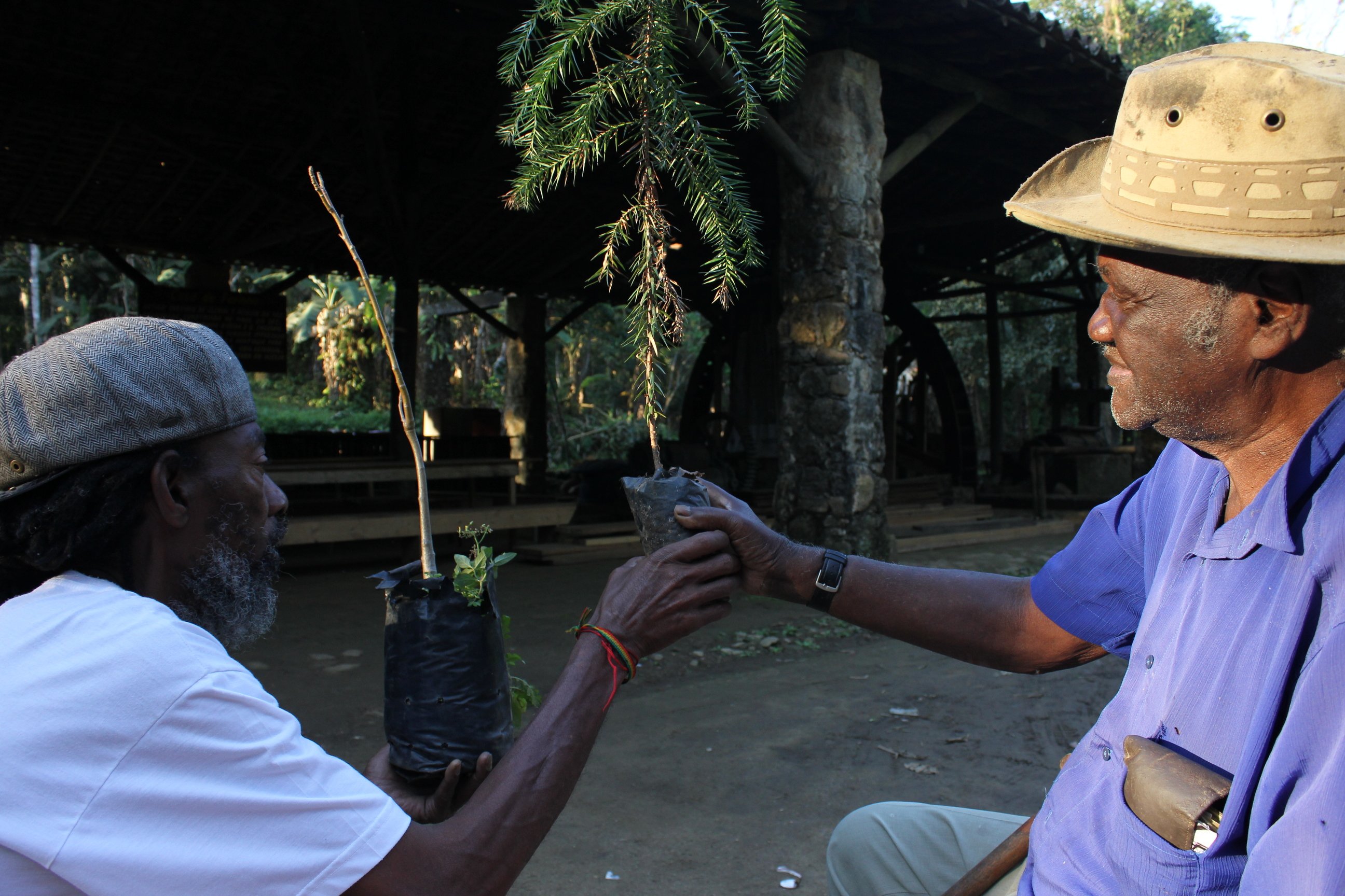 Passamos a noite lá e no dia seguinte percorremos alguns quilômetros a caminho do Quilombo da Fazenda da Caixa. Por lá passamos pelo telecentro da comunidade onde já foi feita ações e intervenções da Rede Mocambos por volta do ano de 2007, e onde nos conectamos através da antena Gesac para fazer as comunicações necessárias com a equipe e com as lideranças que encontramos depois. Logo em seguida fomos caminhando até a Casa de Farinha, onde encontramos Seu Zé Pedro que ali estava sentado cheios de histórias pra contar. A casa de Farinha foi fundada no sec. XIX e utilizava do trabalho escravo para produzir álcool e açúcar, mas hoje produz farinha. Zé Pedro me contou, que os negros que ali trabalhavam foram trazidos de vários países diferentes da África, seu avô por exemplo, veio de Angola e naquele dia deixamos a ele uma muda de Baobá cuja semente veio de Moçambique e foi semeada na Tainã, e também deixamos uma das mudas de araucária dadas pelo mestre Lumumba que serão plantadas pelas mãos de Zé Pedro e pelas mãos d@s quilombolas da comunidade. Trouxemos um quilo de farinha que foi produzida lá e uma compota de mel. Seu Zé Pedro também nos presenteou com seu livro: Eu tenho o meu sonho.